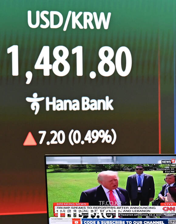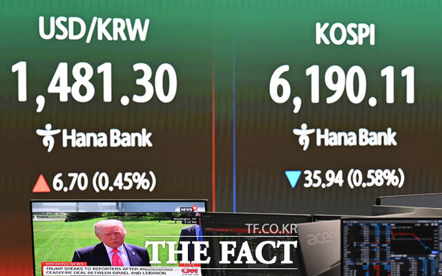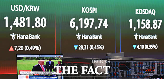 [더팩트ㅣ이새롬 기자] 17일 오전 서울 중구 하나은행 딜링룸에 전광판에 코스피 지수가 표시돼 있다.