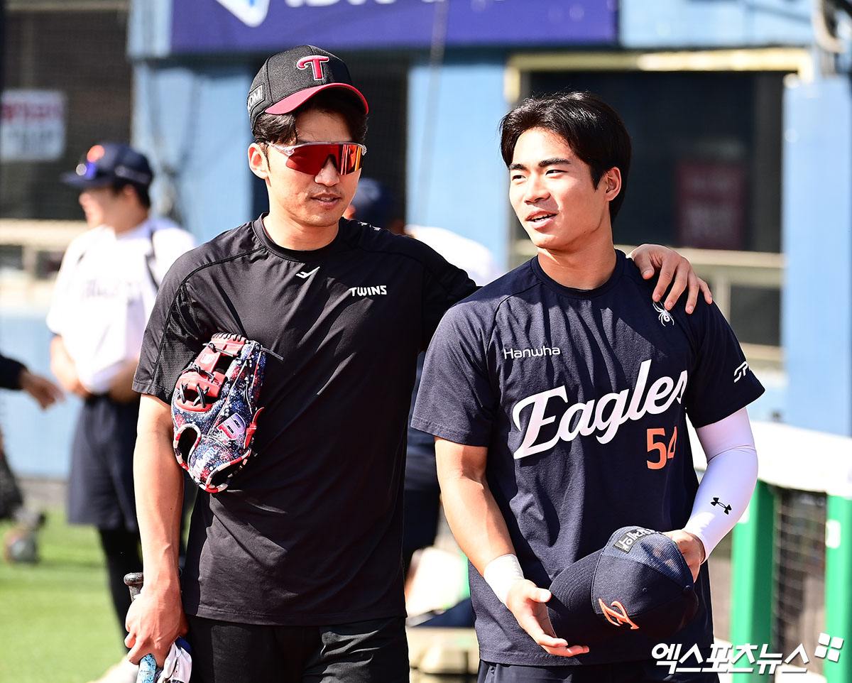 박해민 '오재원에게 다정한 어깨동무'[포토]