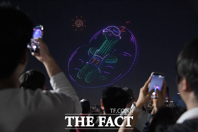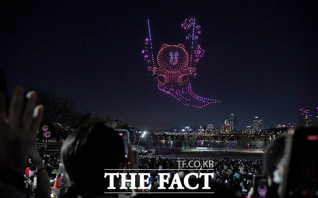 [더팩트 | 박상민 기자] '2026 한강 불빛 공연(드론 라이트 쇼)'이 25일 오후 서울 광진구 뚝섬한강공원에서 열린 가운데 한 가족이 공연을 관람하고 있다.