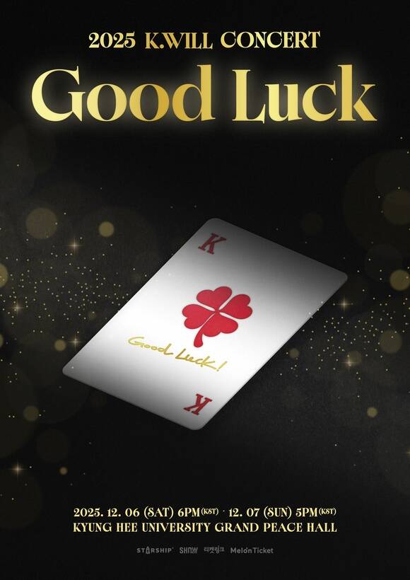 소속사 스타쉽엔터테인먼트는 13일 케이윌 공식 소셜 미디어를 통해 '2025 케이윌 콘서트 굿 럭(Good Luck)' 포스터를 게재했다. 이에 따르면 케이윌은 오는 12월 6일과 7일 서울 경희대학교 평화의전당에서 단독 콘서트 '굿 럭'을 열고 관객들과 만난다.