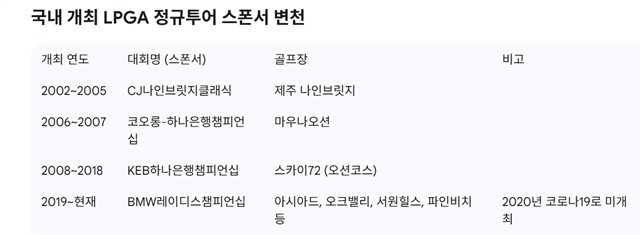 이 같은 현상은 BMW레이디스챔피언십이 역사성이나 상금 규모, 코스관리, 대회 운영 등에서 최고의 대회라는 것을 인정받은 결과라 할 수 있다. BMW대회는 지난 2019년을 대회 원년으로 기록하고 있지만, 그 뿌리는 2002년 시작된 CJ나인브릿지클래식에서 시작된다고 봐야 할 것 같다. 이 대회는 국내에서 처음으로 창설된 LPGA 정규투어로서 4년간 지속됐으며 코오롱-하나은행챔피언십(2006~2007년), KEB하나은행챔피언십(2008~2018년)으로 이어져 오늘에 이르고 있어 사실상 24년의 역사를 가지고 있는 셈이다. 이들 대회는 개최 시기나 대회 참가조건 등이 거의 동일하다. 이러한 역사성이 대회의 권위를 떠받치고 있는 것이다.
