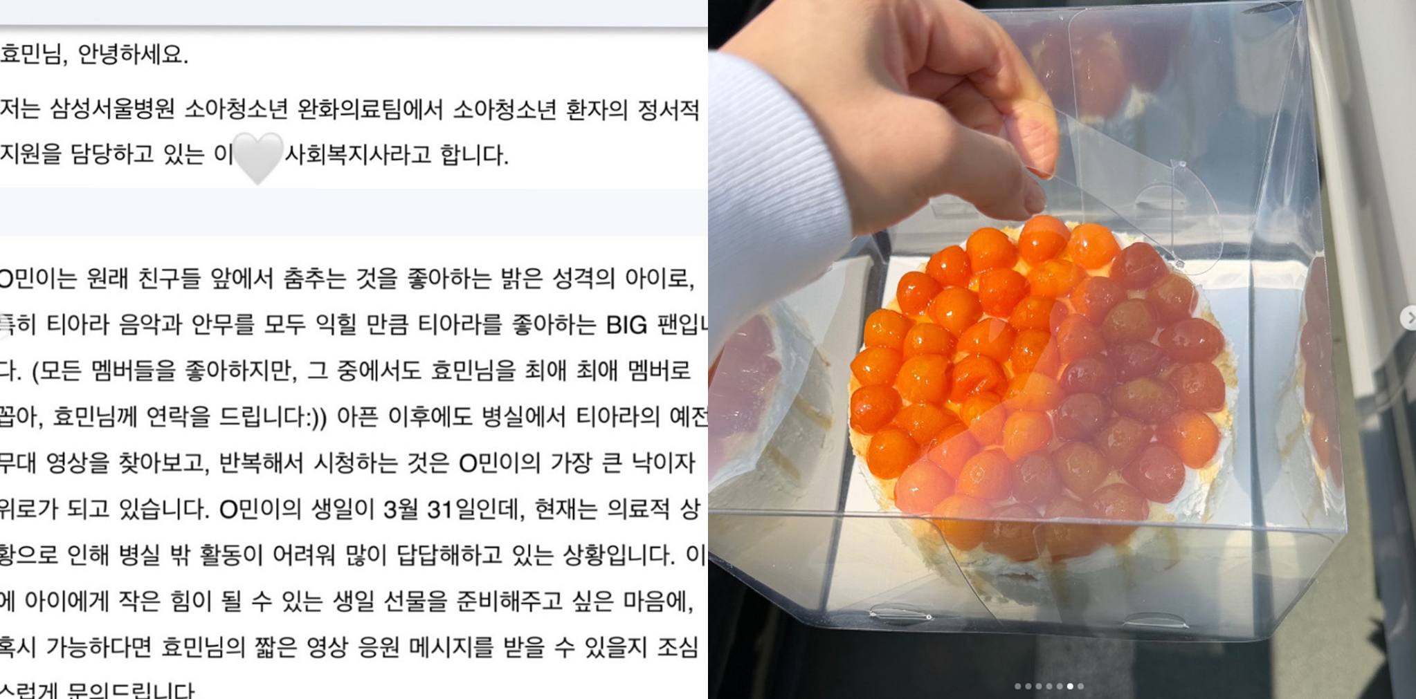 공개된 사진 속 효민은 병실에서 팬과 나란히 앉아 환한 미소를 짓고 있다. 또 팬 가족이 직접 남긴 손편지에는 "힘든 병원 생활에 티아라의 음악은 규민이에게 큰 활력이 됐다"며 "꼭 나아서 티아라의 춤을 다시 추고 싶게 하는 희망을 줬다"는 내용이 담겨 감동을 자아냈다.