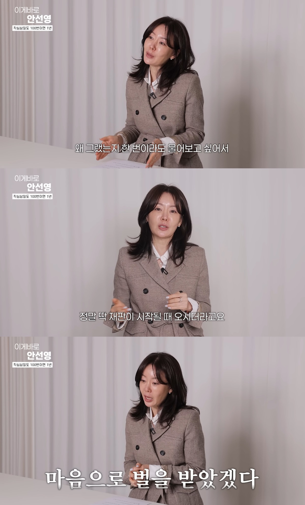 안선영은 "저는 그분을 만나서 '왜 그랬냐'고 한 번이라도 물어보려고 일찍 가 있었다. 근데 그분은 끝까지 안 오다가 재판이 시작될 때 오더라. 다시 한번 느낀 게 뭐냐면 '죄 지은 사람은 발 뻗고 편하게 자지 못하는구나'였다. 마음으로는 벌을 일부 받았겠다는 생각이 들었다"고 털어놓았다.