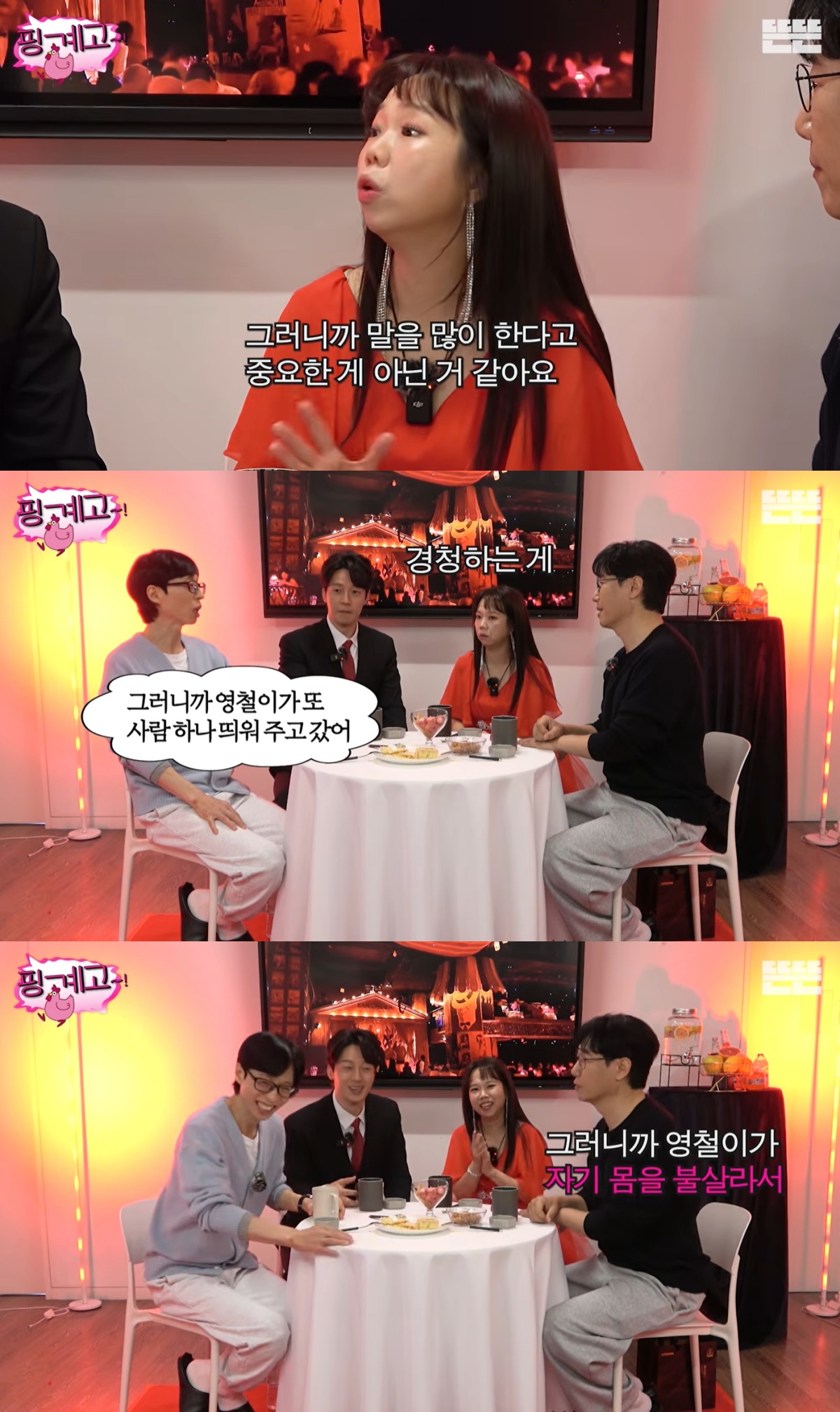 이에 유재석은 "그러니까, 영찰이가 또 사람 하나 띄워주고 갔다"고 말해 웃음을 줬고, 지석진도 "영철이가 자기 몸을 불살라서"라고 거들었다.