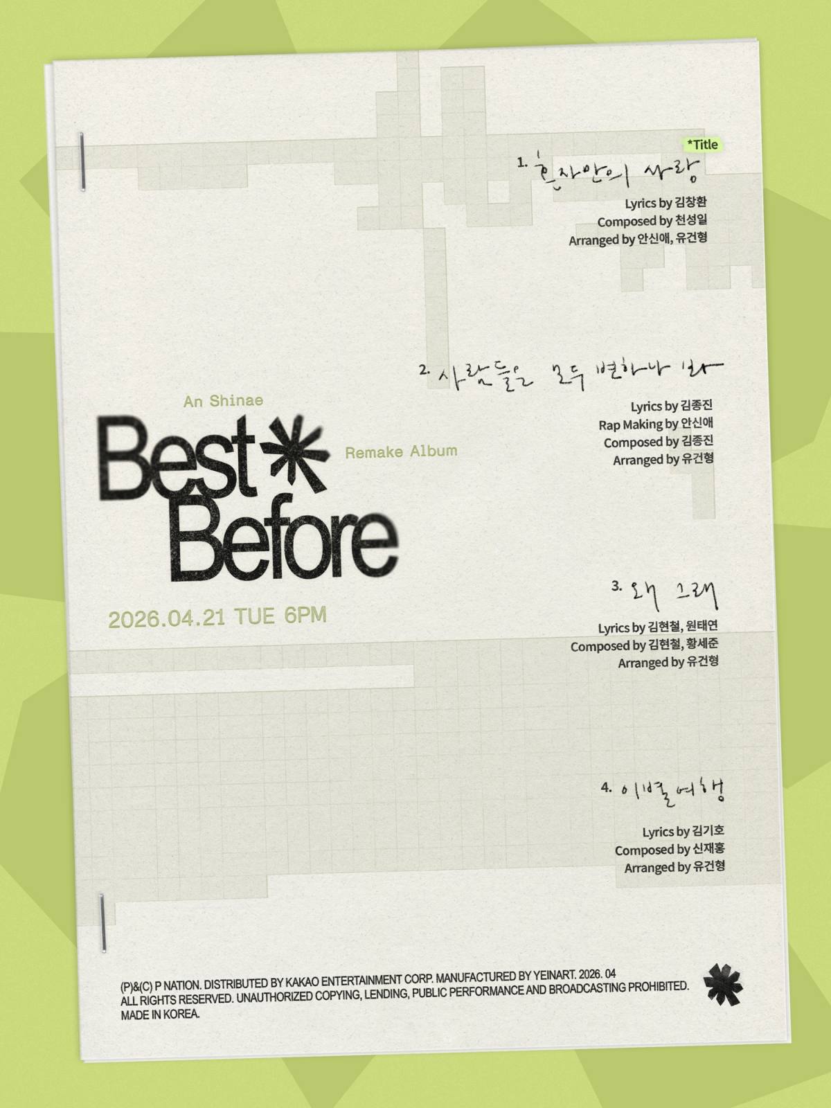 15일 오후 피네이션 공식 SNS 채널에 안신애의 리메이크 앨범 ‘Best Before(베스트 비포)’의 트랙리스트가 공개됐다.