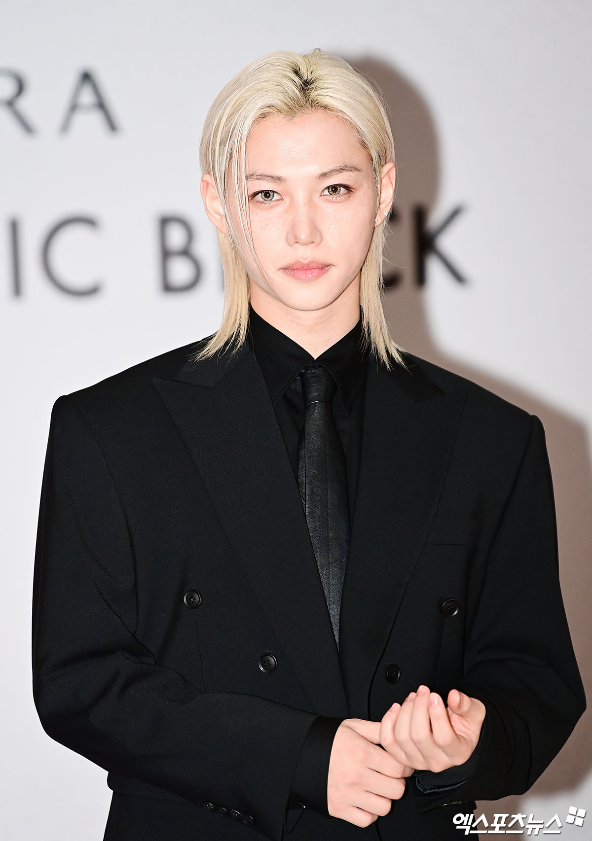 17일 오후 서울 용산구 아모레퍼시픽 본사에서 뷰티 브랜드 이벤트 행사가 진행됐다. 이날 행사에 참석한 필릭스는 올 블랙 스타일링으로 등장해 플래시 세례를 한몸에 받았다.