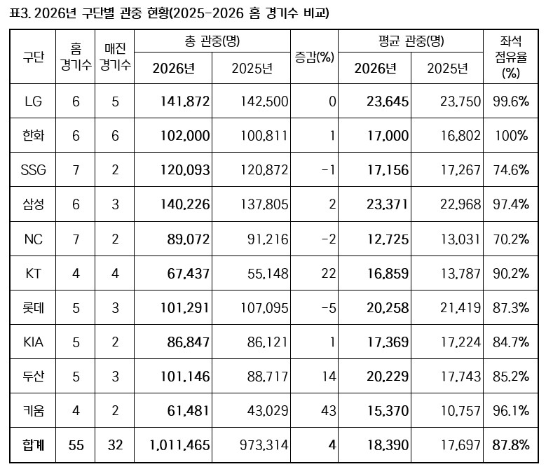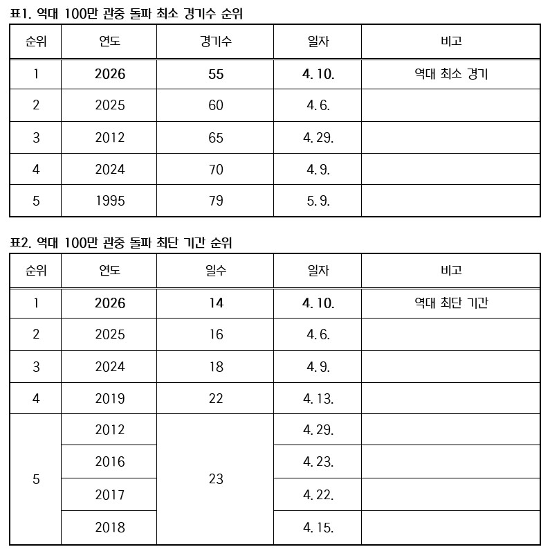 이로써 10일 경기까지 누적 관중 101만1465명을 기록하며 역대 최소 경기인 55경기만에 100만 관중을 달성했다. 종전 기록은 2025시즌에 기록한 60경기다. 10일 55경기만에 달성함에 따라 종전 기록을 5경기 앞당겼다.