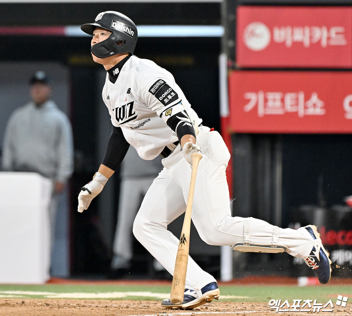 KT는 득점권 기회를 놓치지 않았다. 주인공은 김현수였다. 김현수는 볼카운트 2볼 2스트라이크에서 김태형의 5구 137km/h 슬라이더를 잡아당겨 투런 아치를 그렸다. 김현수의 시즌 3호 홈런. 비거리는 118.5m로 측정됐다.