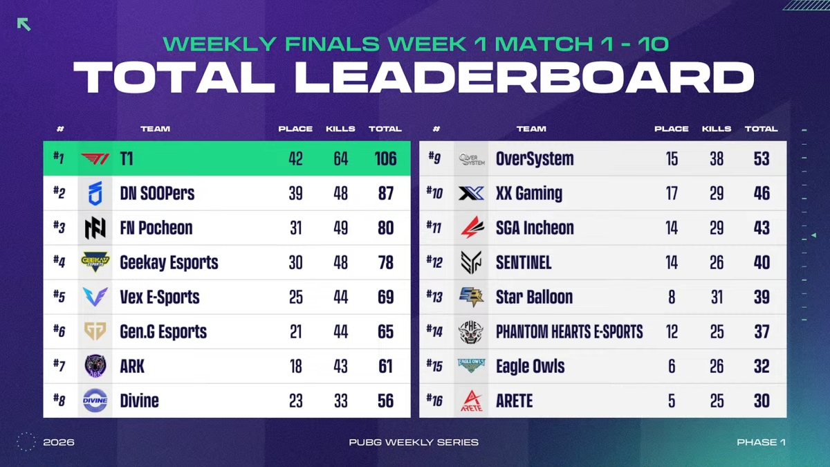 (엑스포츠뉴스 이정범 기자) '2026 PWS: 페이즈 1' T1이 1주 차 '위클리 파이널' 최종 1위에 올랐다.