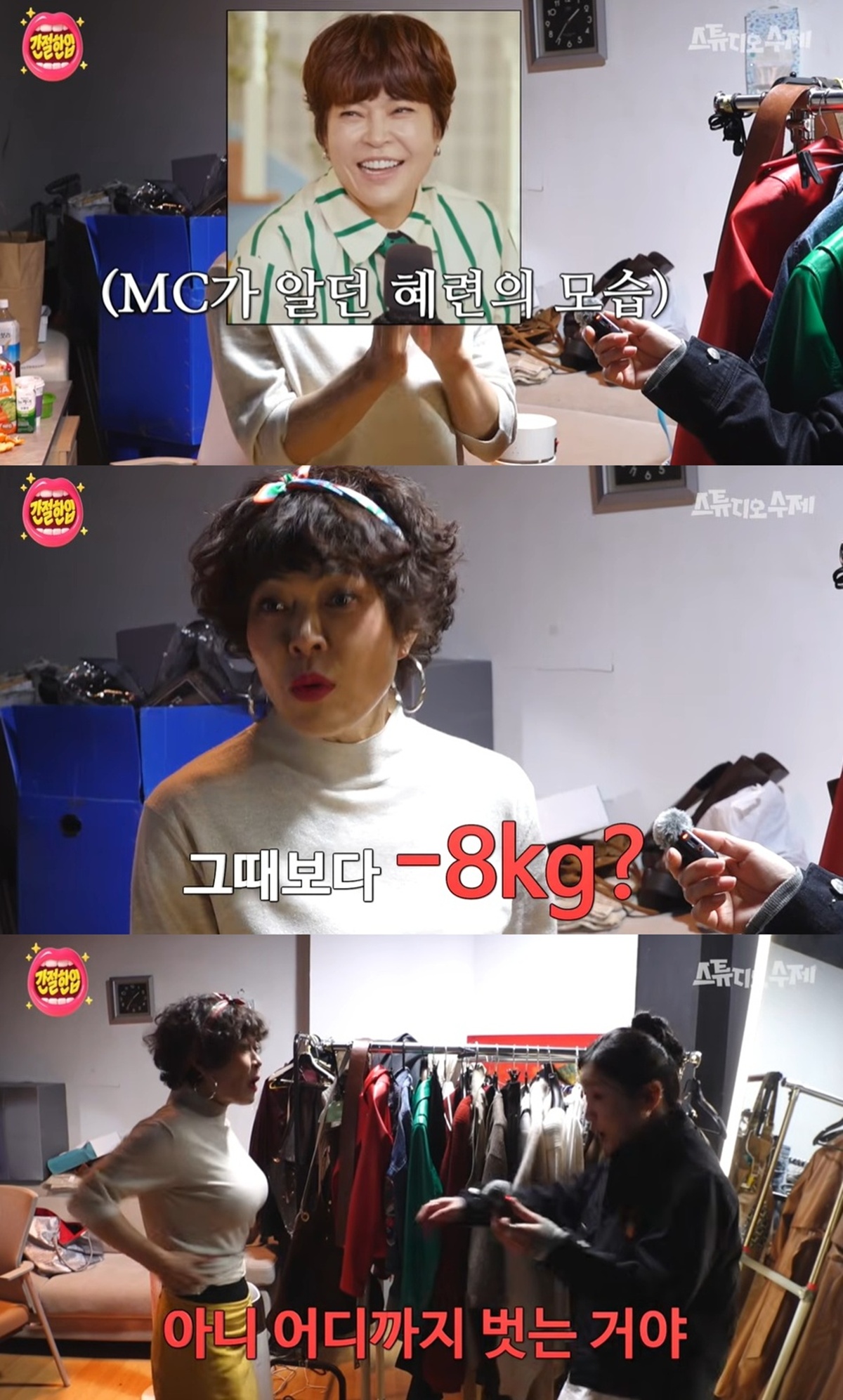 조혜련은 김지유를 대기실로 안내했고, 김지유에게 "그 때 봤을 때와 완전히 달라지지 않았냐. 8kg 정도가 빠졌다"고 체중 감량 소식을 전했다.