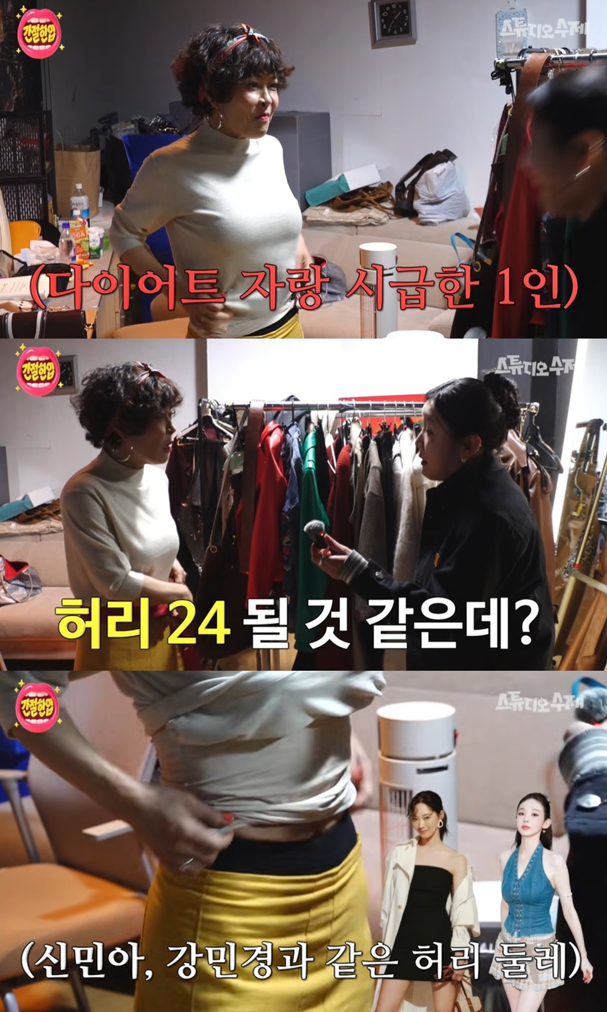 이어 "지금 봐봐"라며 허리 사이즈를 보여주기 위해 옷 매무새를 가다듬었고, "어디까지 내리는거야"라고 당황하는 김지유를 향해 "허리 사이즈는 24인치 정도 될 것 같다"고 얘기했다.