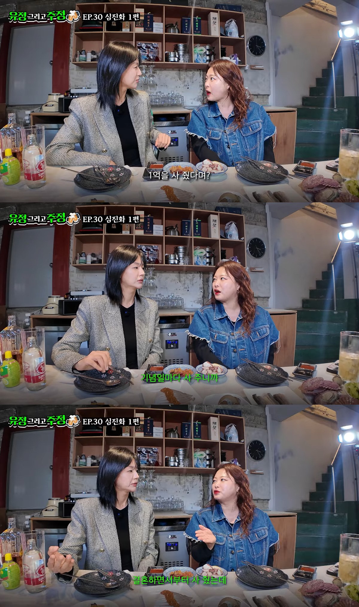 심진화는 "왜냐하면 저희가 결혼한 지 15년 됐는데 기념일마다 사 주니 1억 된다"고 인정했고, 서유정은 "그럼 어림잡아 10개 넘는 것 같다. 15개에서 17개 정도 되겠다"며 감탄했다.