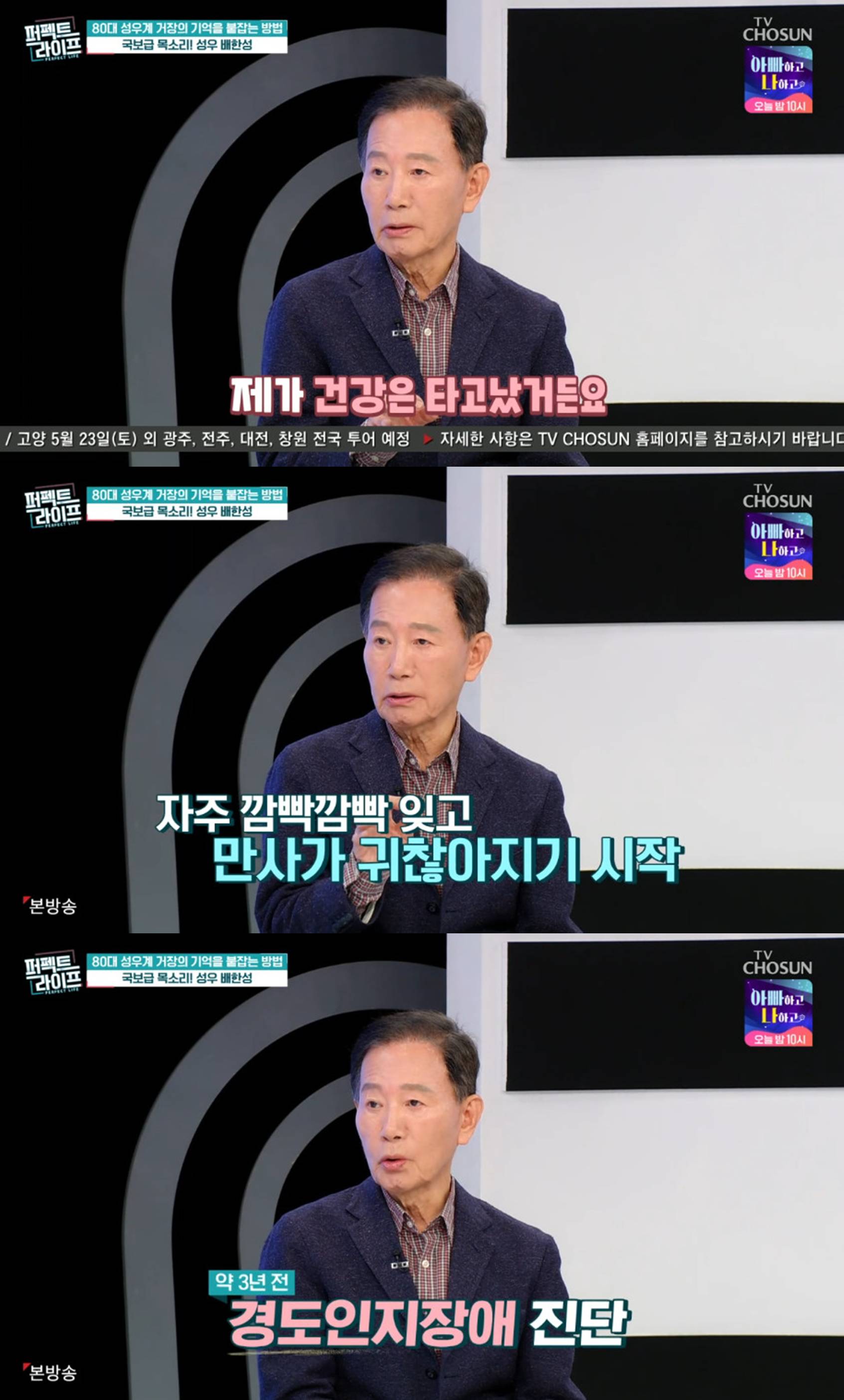 배한성은 최근 건강 상태에 대해 "타고난 건강이라 병원에 잘 가지 않았는데, 2~3년 전부터 물건을 자주 잃어버리고 만사가 귀찮아졌다"고 털어놨다.