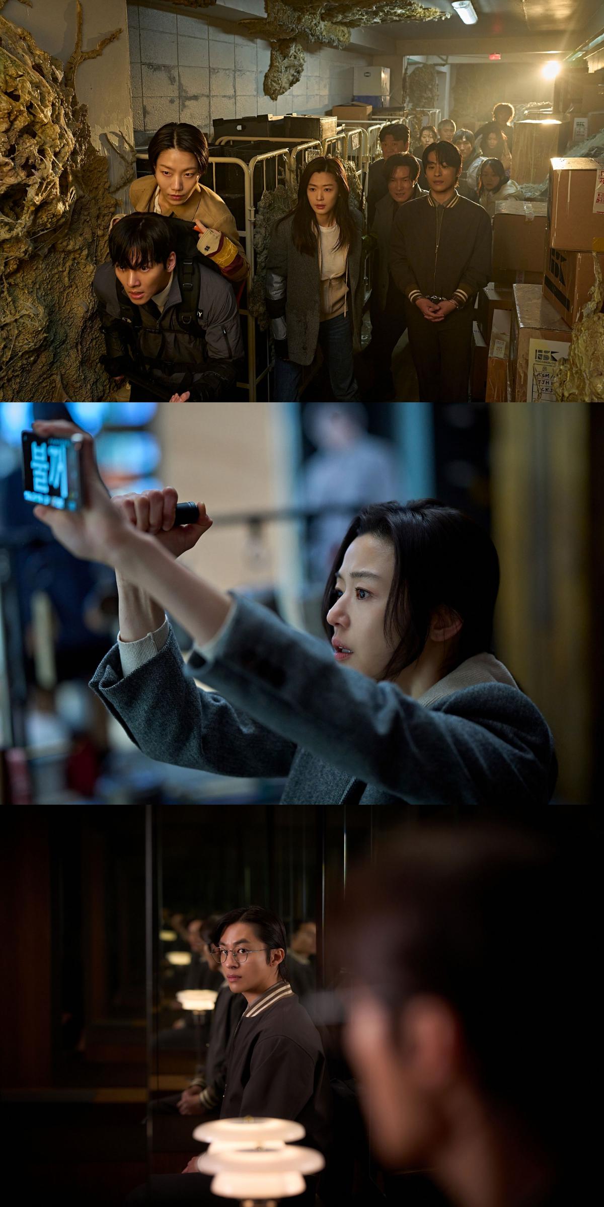 먼저, 휴대폰과 손전등을 든 채 절박한 표정으로 누군가를 바라보고 있는 권세정(전지현 분)의 모습이 눈길을 끈다. 휴대폰 속 글씨를 통해 그가 과연 누구에게 메시지를 전하고 있는 것인지, 그가 파악한 감염자들의 패턴은 무엇일지 호기심을 높인다.