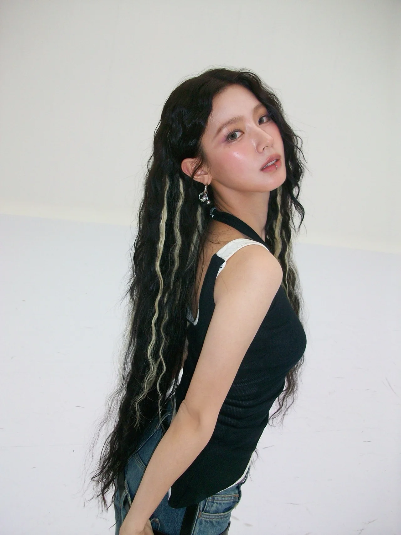 눈가에 얹어진 핑크와 퍼플 사이의 모호한 색조는 퇴폐적이면서도 성스러운 기운을 동시에 풍긴다. 이는 완벽한 대칭을 이루는 그녀의 골격 위에서 일종의 미학적 반항으로 기능하며, 전형적인 아이돌 메이크업의 공식을 가볍게 무너뜨린다.