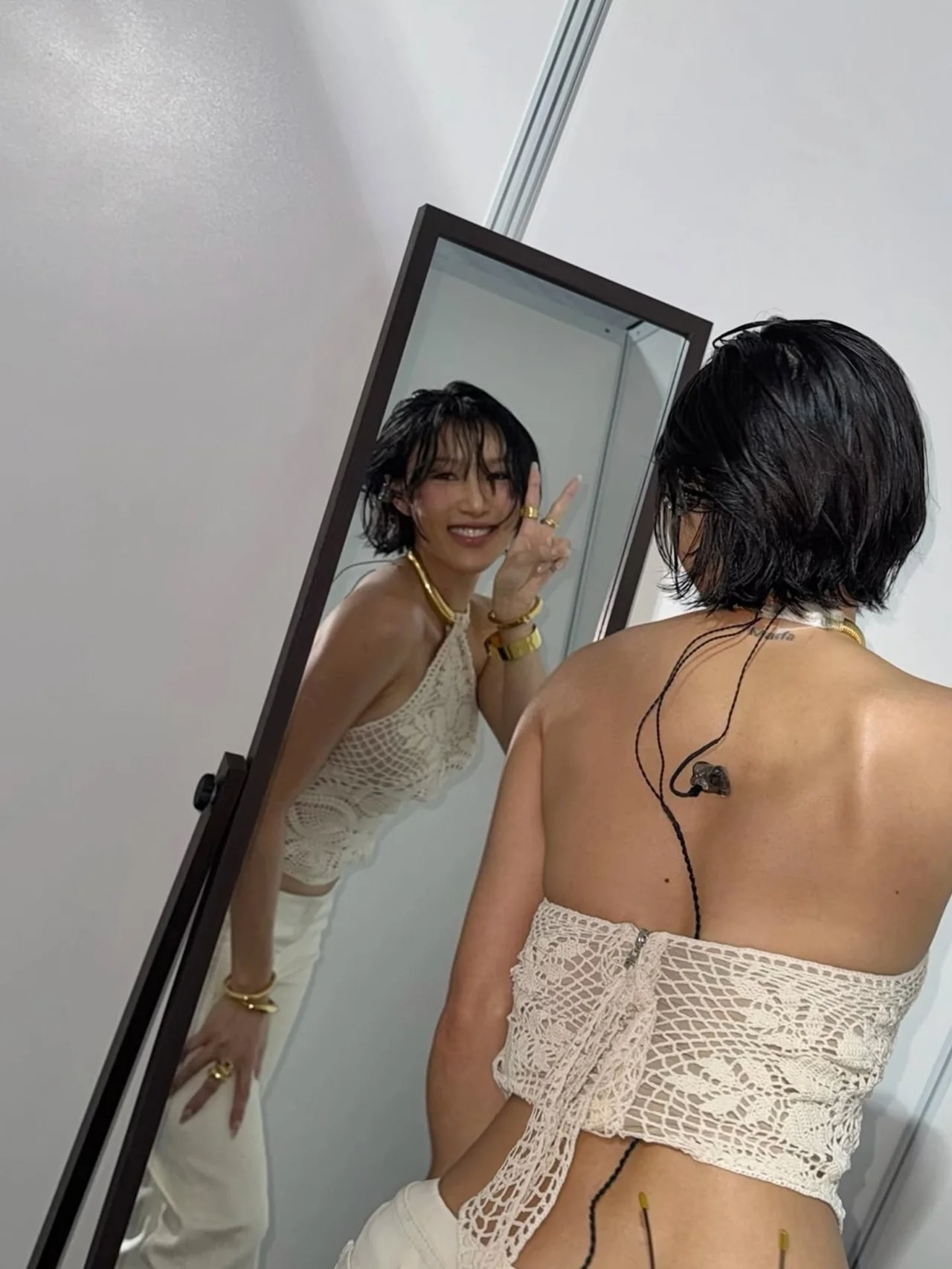 청순한 긴 생머리를 늘어뜨린 채 블랙 알로(alo) 캡 모자를 매치한 감각이 돋보인다. 자칫 너무 노출에만 치중될 수 있는 룩에 스포티한 캡 모자를 더함으로써 건강하고 활동적인 무드를 한껏 끌어올렸다. 눈을 살짝 가린 채 미소 짓는 표정은 꾸미지 않은 듯한 자연스러움을 완성하며, 가슴팍의 실버 펜던트 목걸이는 밋밋할 수 있는 화이트 톱 위에 은은한 마침표를 찍는다.