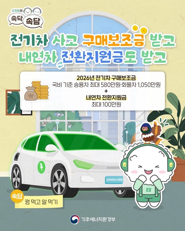 올해부터는 기후부(기후에너지환경부) 지침 개정에 따라 내연기관 차량을 폐차하거나 판매하고 전기차를 구매하는 경우 ‘전환지원금 100만 원’이 신설되어 지원 폭이 넓어졌다.