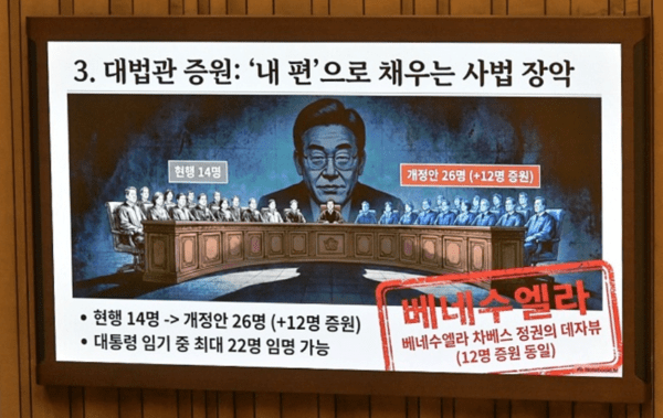 그러면서 "특히 대법관 수를 14명에서 26명으로 늘리는 법원조직법 개정안에 대해 “이재명 정부 임기 내에 22명의 대법관을 임명하게 되는 전형적인 코트 패킹(Court-packing)”이라며 “베네수엘라 차베스 정권이 대법관을 증원해 사법부를 권력의 도구로 전락시킨 독재의 길을 그대로 밟고 있다”고 주장했다.