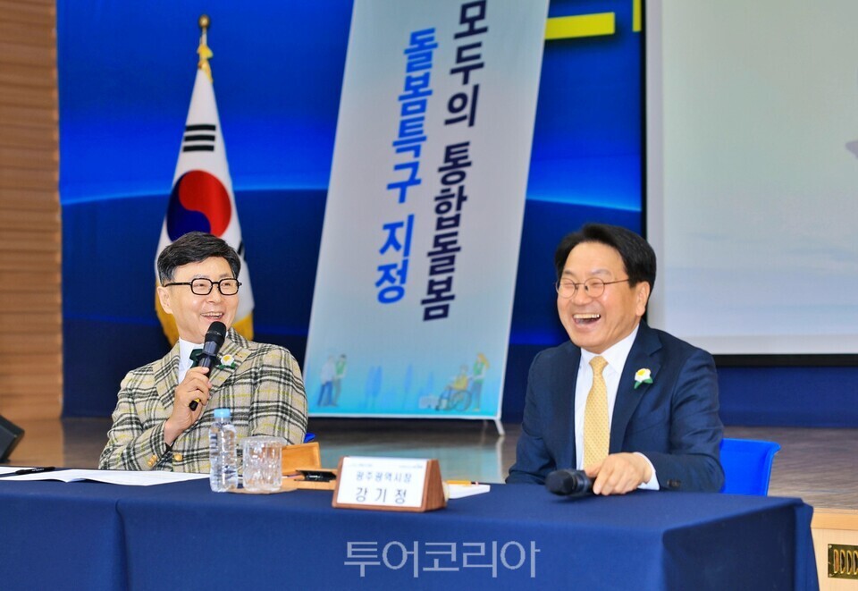 9일 전남·광주 행정통합 상생토크쇼에서 김철우 보성군(왼쪽)와 강기정 광주광역시장이 보성군 현안에 대한 질의 응답을 진행하던 중 강기정 광주시장이 활짝 웃고 있다./사진=보성군상생토크쇼에서는 ▲‘전남·광주 통합특별시 설치를 위한 특별법’의 주요 내용, ▲ 통합에 따른 변화, ▲ 정부의 약 20조 원 규모 재정 지원 계획, ▲ 통합이 가져올 정책적 변화와 지역 발전 가능성 등에 대한 설명이 이뤄졌다.