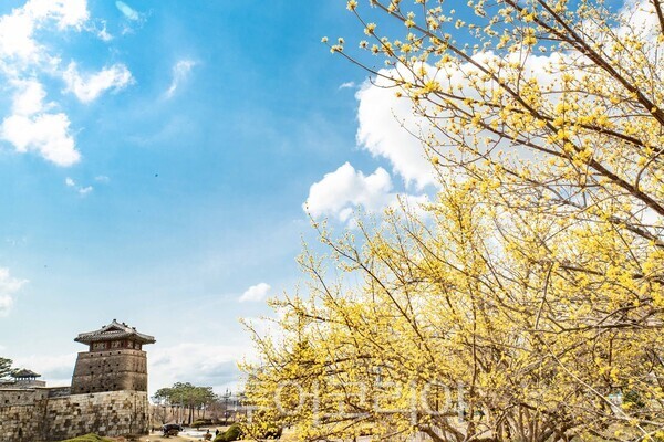 이 시장이 첫 번째로 꼽은 명소는 화서문에서 장안문까지 이어지는 장안공원 성곽길의 산수유다. 봄의 전령으로 불리는 노란 산수유가 유네스코 세계문화유산인 수원화성 성곽과 어우러지며 이색적인 풍경을 연출한다. 그는 "우산처럼 모여 피어난 노란 산수유가 성곽과 어우러져 특별한 풍경을 선사한다"고 설명했다.