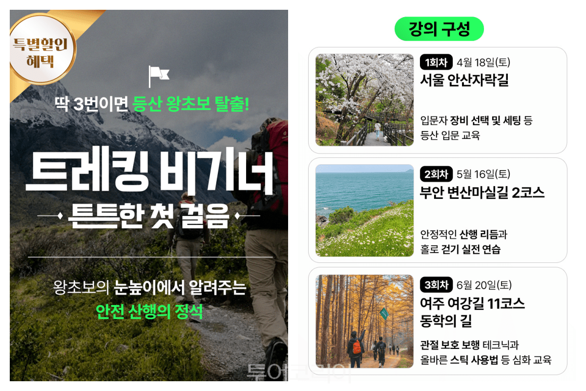 트레킹비기너 걷기 /사진-승우여행사[투어코리아=조성란 기자] 혼자 산을 찾는 ‘혼산’ 트렌드가 확산되면서, 초보자를 위한 체계적인 트레킹 입문 프로그램이 등장했다. 걷기와 산행을 취미로 시작하려는 수요가 늘어나는 가운데, 기초부터 차근히 배울 수 있는 실전형 코스에 관심이 쏠리고 있다.