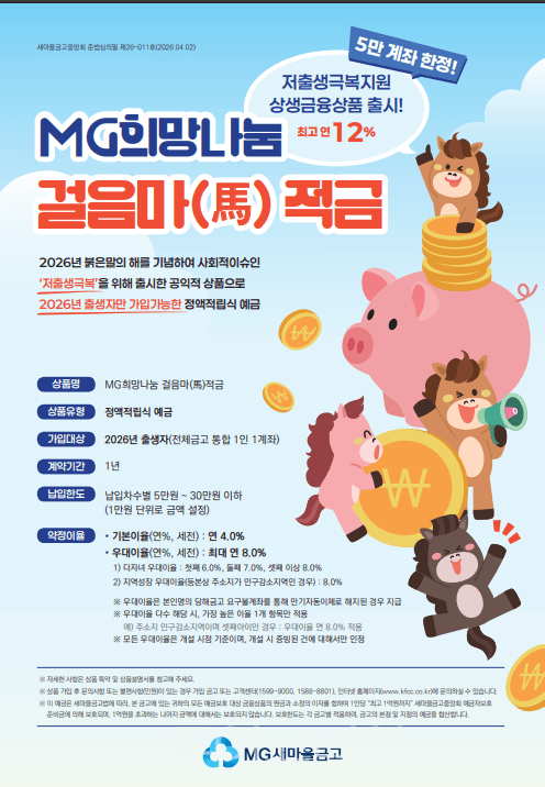 새마을금고중앙회(회장 김인)는 저출생 극복 지원을 위한 금융상품 ‘MG희망나눔 걸음마(馬)적금’을 출시했다.