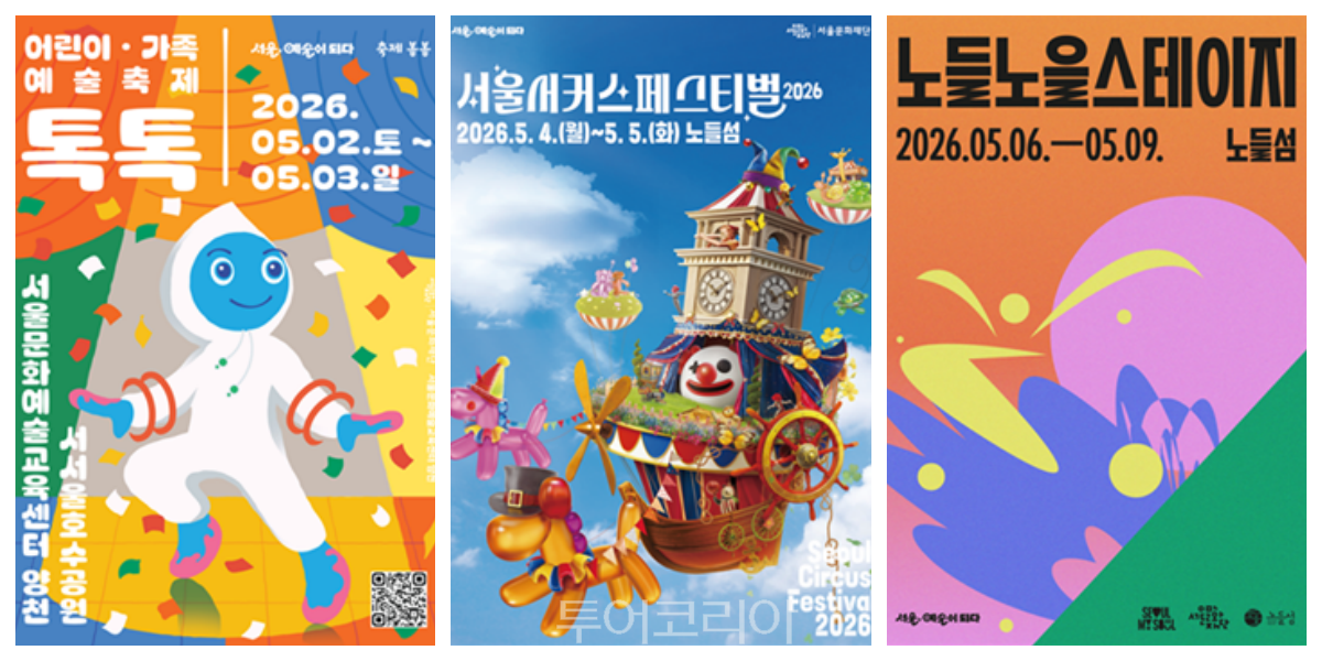 어린이가족예술축제 톡톡(우), 노들노을스테이지(좌) /사진-서울시[투어코리아=유경훈 기자] 피크닉 매트를 들고 나갈 이유가 하나 더 생겼다. 올 봄, 서울의 공원은 ‘예술 놀이터’로 변한다. 노들섬과 서울숲을 중심으로 5월 1일부터 9일까지 9일간 가족 예술축제 '축제 봄봄'이 펼쳐져 즐거움을 더한다. 음악과 서커스, 전시와 체험까지 다양한 콘텐츠가 도심 곳곳에서 펼쳐지며, 아이부터 부모, 조부모까지 전 세대가 함께 즐기는 ‘도심형 봄소풍 코스’로 주목받고 있다.
