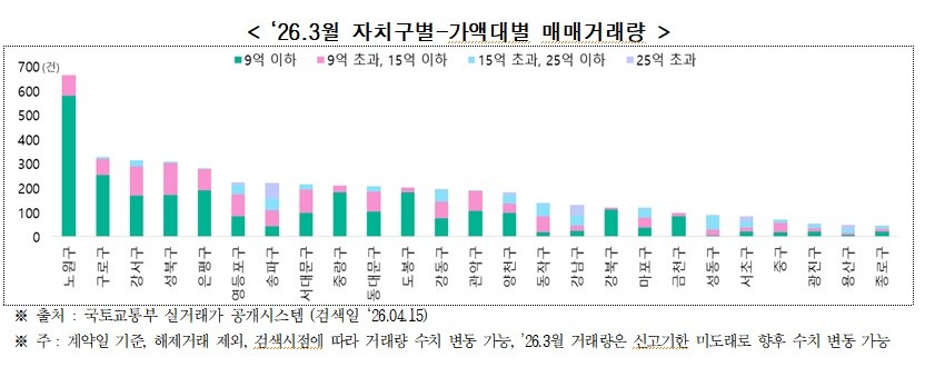 가액대별 거래량을 보면, 3월의 경우 15억 원 이하 거래 비중은 85.3%로 전월(81.5%) 대비 3.8%p 증가하며 지난해 11월 이후 15억 이하 거래의 증가세를 이어가고 있다.