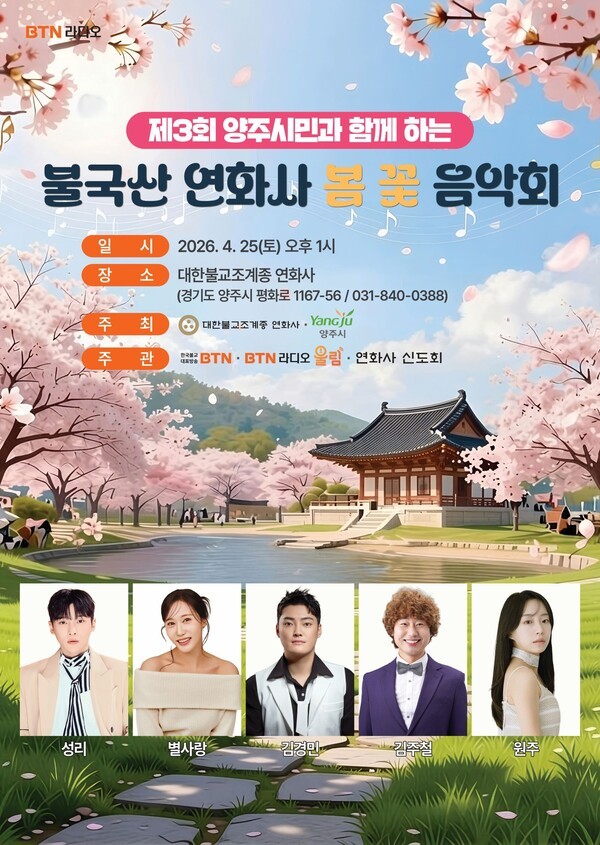 양주시와 대한불교조계종 연화사가 공동 주최하는 '제3회 양주시민과 함께하는 불곡산 연화사 봄꽃 음악회'가 25일 오후 1시 연화사(주지 호성스님)에서 열린다. BTN불교TV·BTN라디오·연화사 신도회가 주관하며 올해로 3회째를 맞았다.