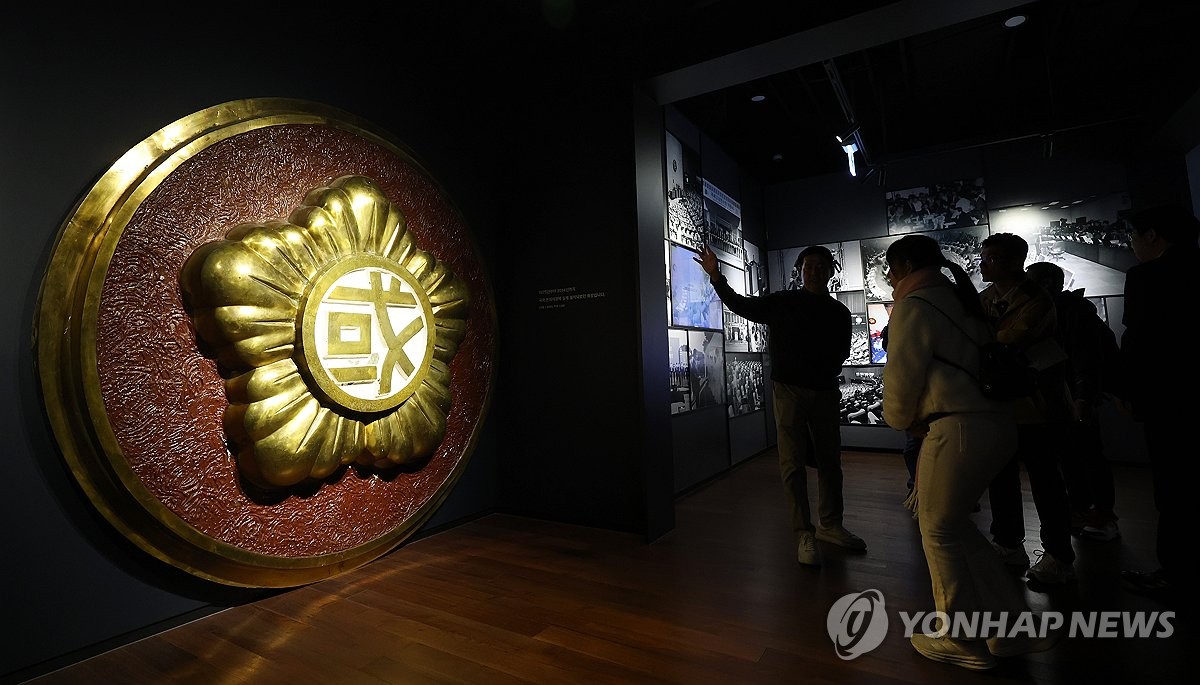 (서울=연합뉴스) 이동해 기자 = 여야 의원 187명이 발의한 '대한민국헌법 개정안' 공고안이 국무회의에서 심의·의결된 6일 서울 여의도 국회박물관 기획전시실에 1975년부터 2014년까지 국회 본회의장에 설치됐던 휘장이 전시돼 있다. 2026.4.6 eastsea@yna.co.kr