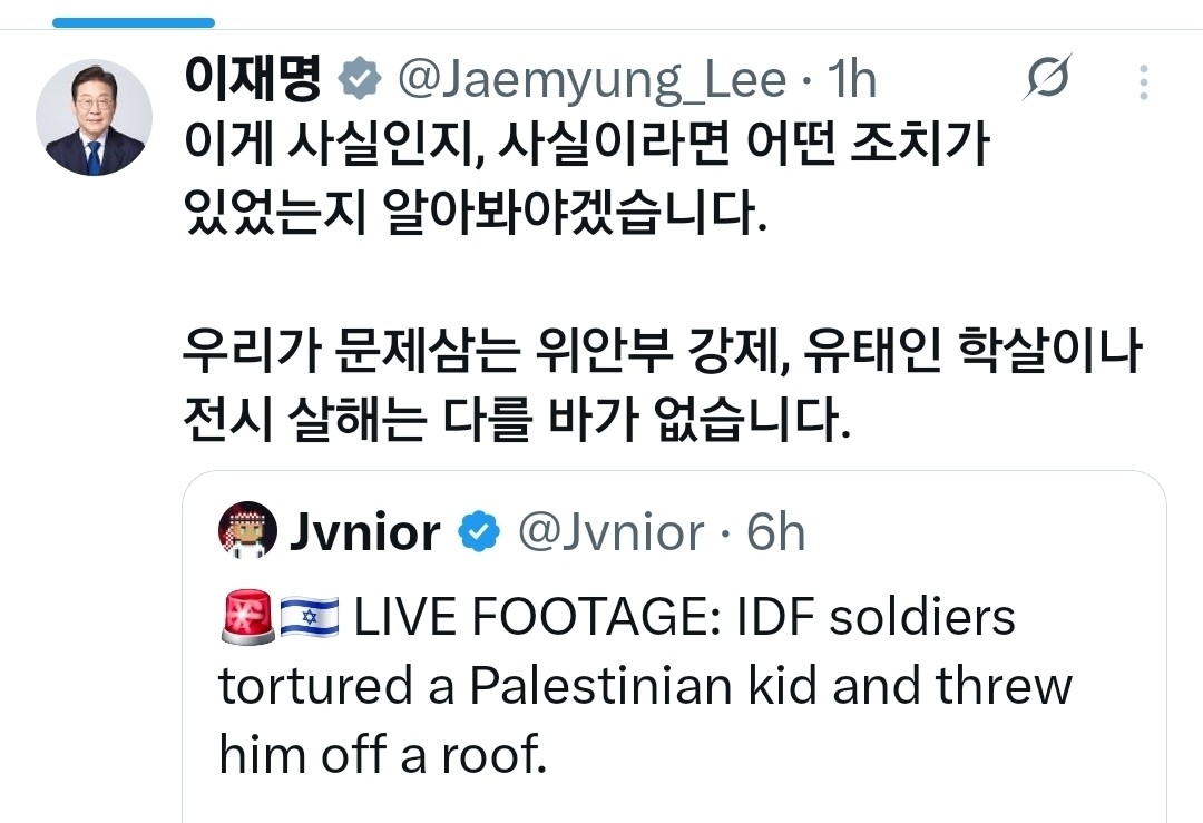 이 대통령이 공유한 글에는 해당 영상과 관련해 이스라엘 방위군(IDF)이 팔레스타인 어린이를 고문한 뒤 옥상에서 밀어서 떨어뜨리는 장면이라는 취지의 설명이 달려있다.