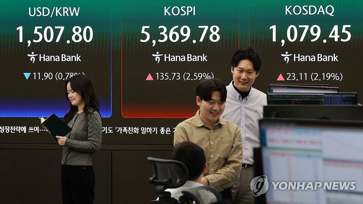 코스피는 141.45포인트(2.70%) 오른 5,375.50으로 개장했으며 코스닥도 22.83포인트(2.16%) 오른 1,079.17으로 출발했다.
