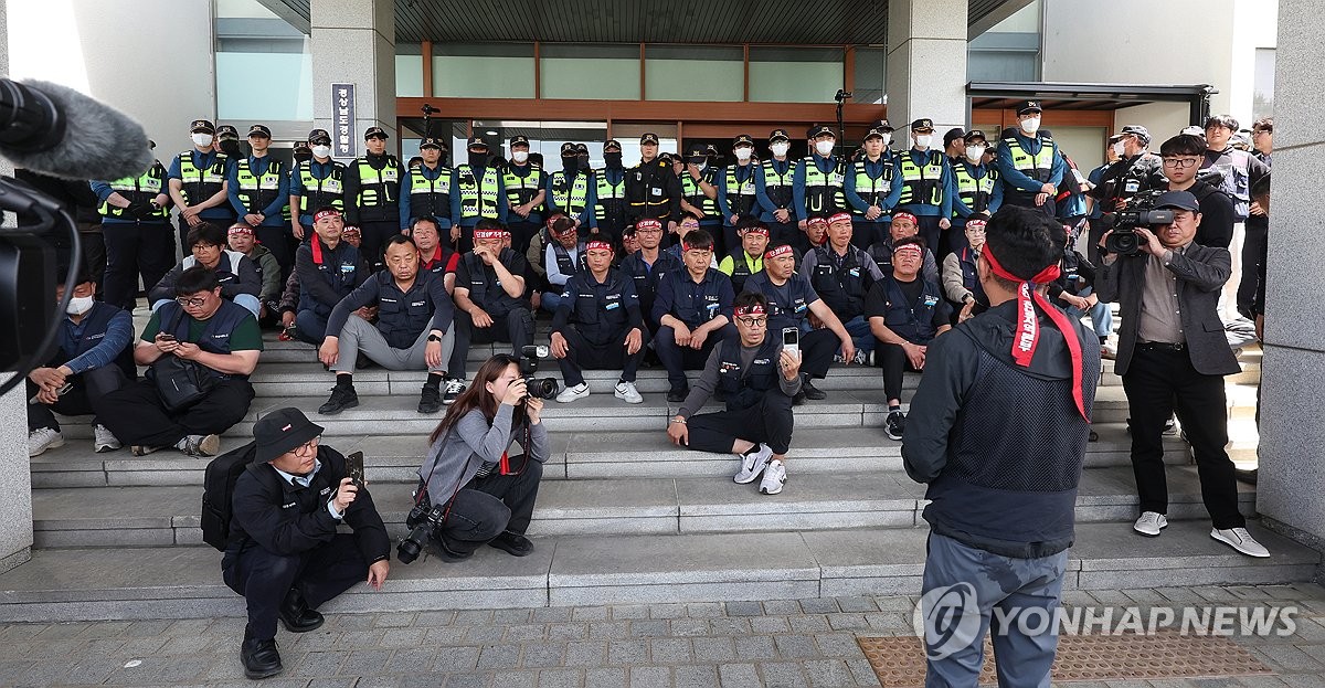 (창원=연합뉴스) 김동민 기자 = 민주노총 공공운수노조 화물연대가 21일 오전 경남 창원시 의창구 경남경찰청 입구에서 경남청장 면담을 요구하고 있다. 2026.4.21 image@yna.co.kr