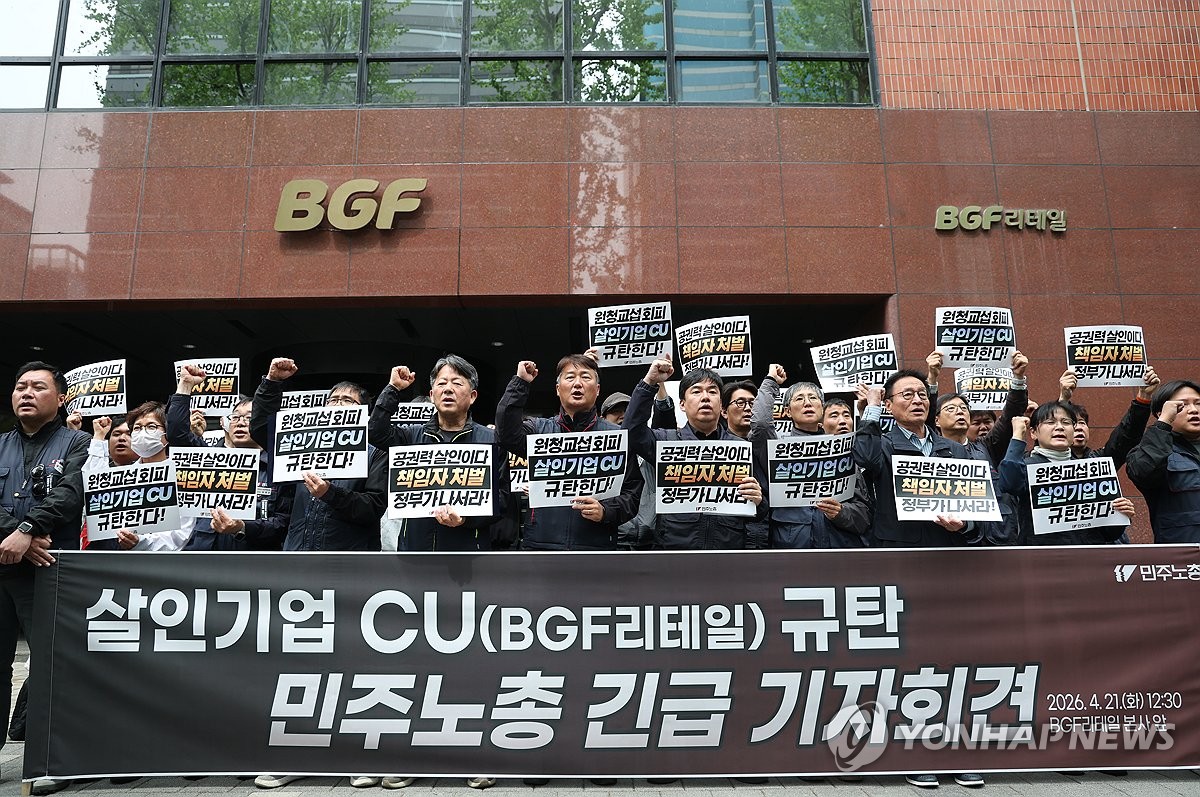 (서울=연합뉴스) 신준희 기자 = 경남 진주 화물연대 조합원 사상 사고 이틀째인 21일 서울 강남구 BGF리테일 본사 앞에서 민주노총 양경수 위원장 등이 CU 규탄 긴급 기자회견을 하고 있다. 2026.4.21 hama@yna.co.kr