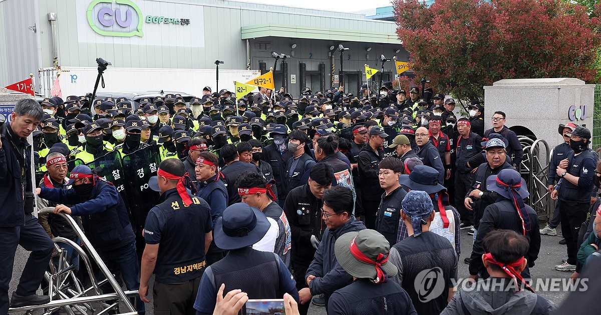 (창원·진주=연합뉴스) 정종호 기자 = 경남 진주 CU 물류센터에서 BGF리테일에 공동교섭을 촉구하기 위한 집회 과정에서 민주노총 공공운수노조 화물연대(이하 화물연대) 소속 조합원이 숨지거나 다친 사고가 난 가운데 노조가 사고 발생 이틀째인 21일 기자회견과 대규모 집회를 예고하면서 이번 사태가 장기화할 조짐을 보인다.