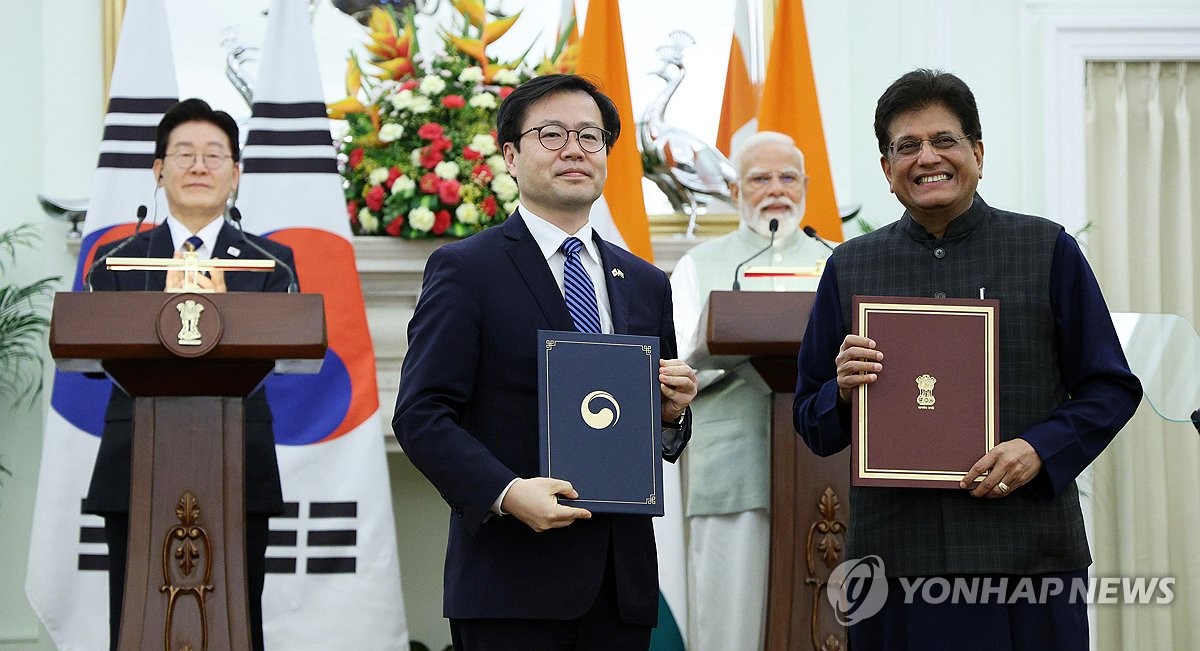 (뉴델리=연합뉴스) 김도훈 기자 = 여한구 산업통상자원부 통상교섭본부장과 피유시 고얄 인도 상공부 장관이 20일(현지시간) 인도 뉴델리 영빈관에서 이재명 대통령과 나렌드라 모디 총리가 임석한 가운데 CEPA 개선협상 재개 공동선언 문건 교환 후 기념촬영을 하고 있다. 2026.4.20 superdoo82@yna.co.kr