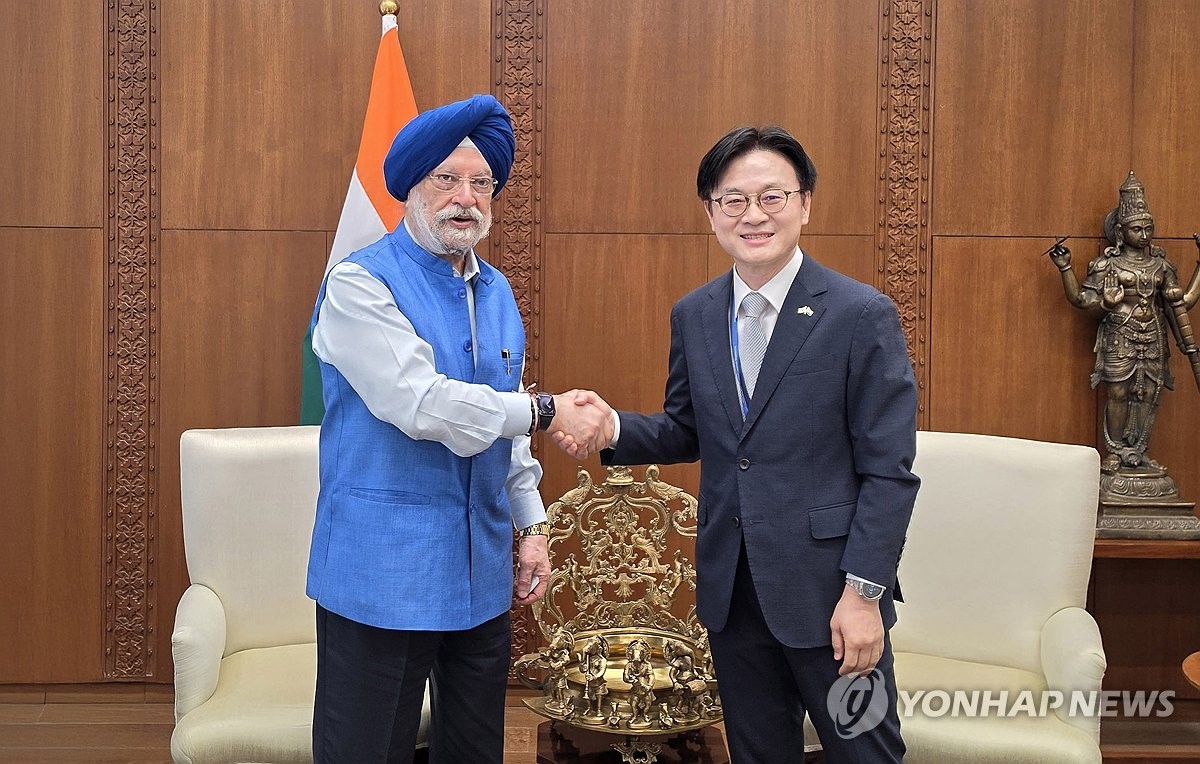 (서울=연합뉴스) 김정관 산업통상부 장관이 20일(현지시간) 인도 석유천연가스부 회의실에서 하르딥 싱 푸리 인도 석유천연가스부 장관과 면담하기 전 기념사진을 찍고 있다, 양국 장관은 이날 나프타를 비롯한 에너지·자원 및 에너지 수송 관련 조선·해양 분야의 후속 협력 방안에 대해 구체적으로 논의했다. 2026.4.20 [산업통상부 제공. 재판매 및 DB 금지] photo@yna.co.kr
