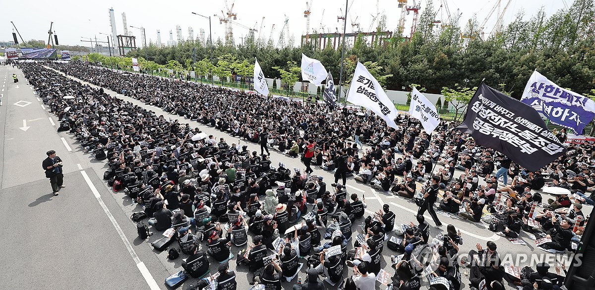 (평택·서울=연합뉴스) 김광호 한지은 기자 = 삼성전자 노동조합이 성과급 상한제 폐지를 요구하며 4만명 규모 집회를 열고 총파업을 예고했다.