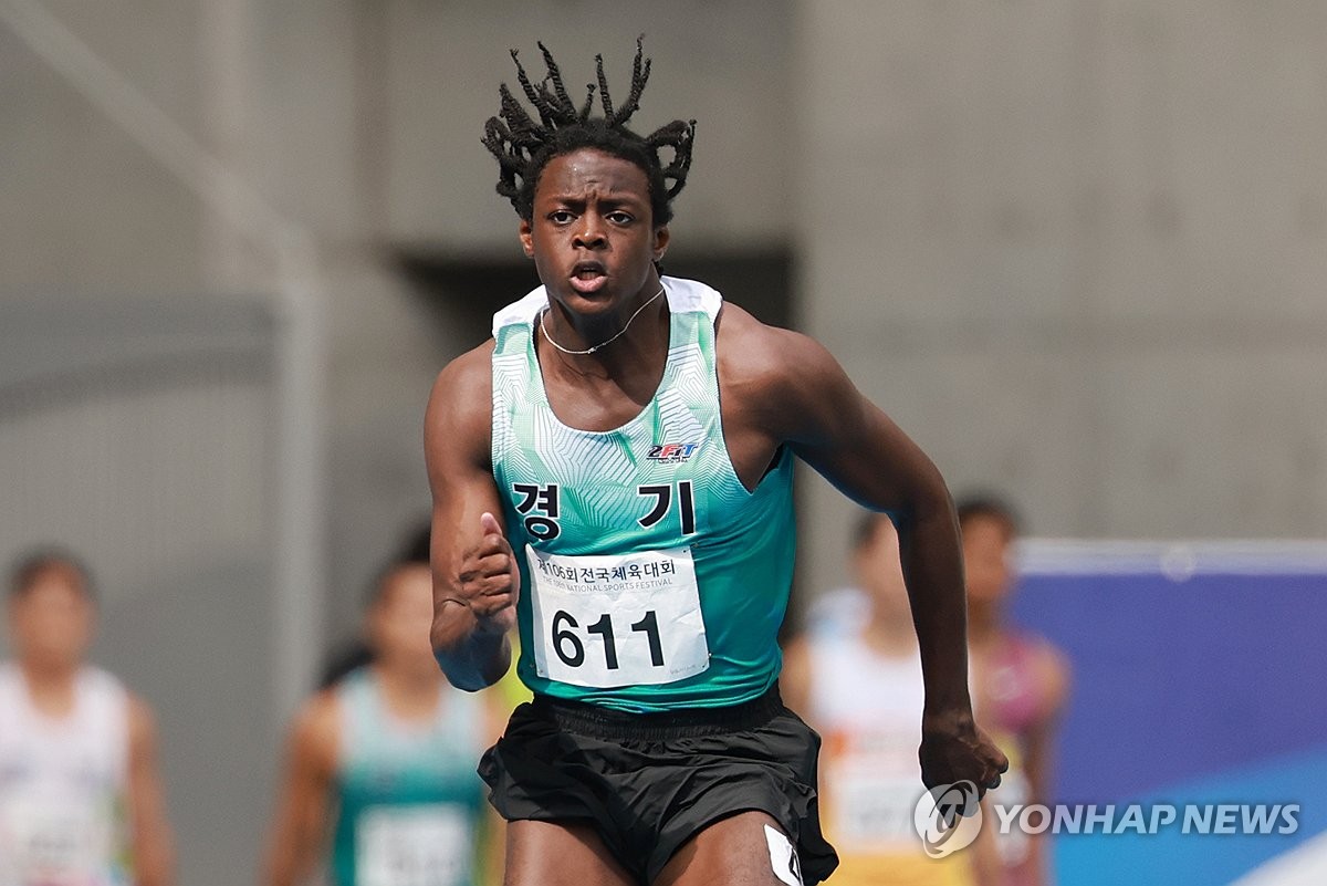 (부산=연합뉴스) 신현우 기자 = 19일 부산 아시아드주경기장에서 열린 제106회 전국체육대회 육상 남자 100m 예선에서 비웨사 다니엘 가사마(안산시청)가 달리고 있다. 2025.10.19 nowwego@yna.co.kr