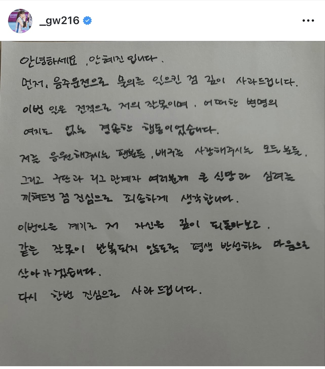 안혜진 "변명의 여지 없는 경솔한 행동…평생 반성하며 살 것"
