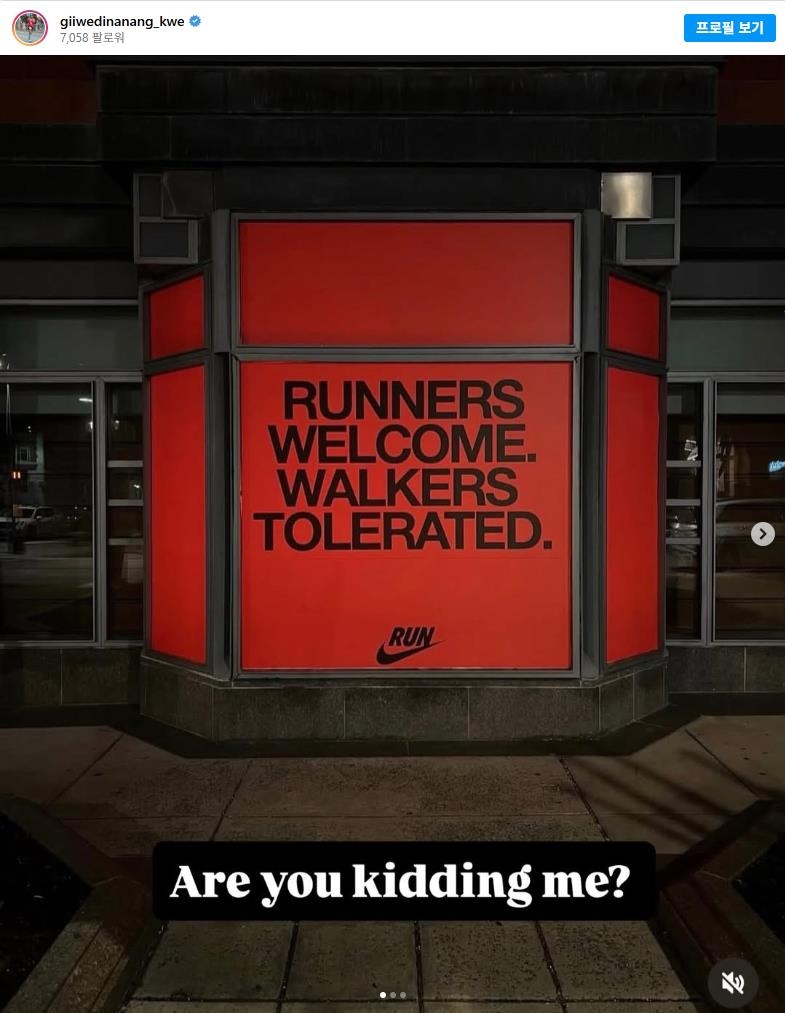 나이키는 최근 미국 매사추세츠주 보스턴에 위치한 자사 매장 쇼윈도에 '러너는 환영, 워커는 용인'(RUNNERS WELCOME. WALKERS TOLERATED)이라는 대형 간판을 설치했다.