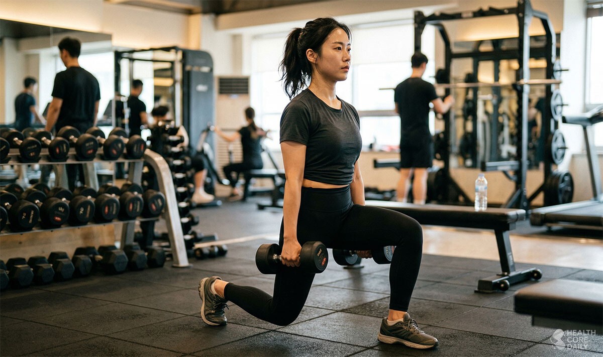 이지현이 영상에서 가장 먼저 보여준 동작은 양손에 무거운 덤벨을 들고 실시하는 '런지'다. 런지는 한쪽 다리를 앞으로 내디디며 허벅지와 엉덩이 근육을 발달시키는 데 탁월한 하체 운동이다. 단순히 맨몸으로 할 때보다 무게감이 있는 도구를 더하면 근육에 가해지는 힘이 커져 근육량을 늘리는 데 큰 도움을 준다. 이는 몸이 기본적으로 사용하는 에너지 양을 높여 살이 잘 찌지 않는 몸을 만드는 데 효과가 있다.