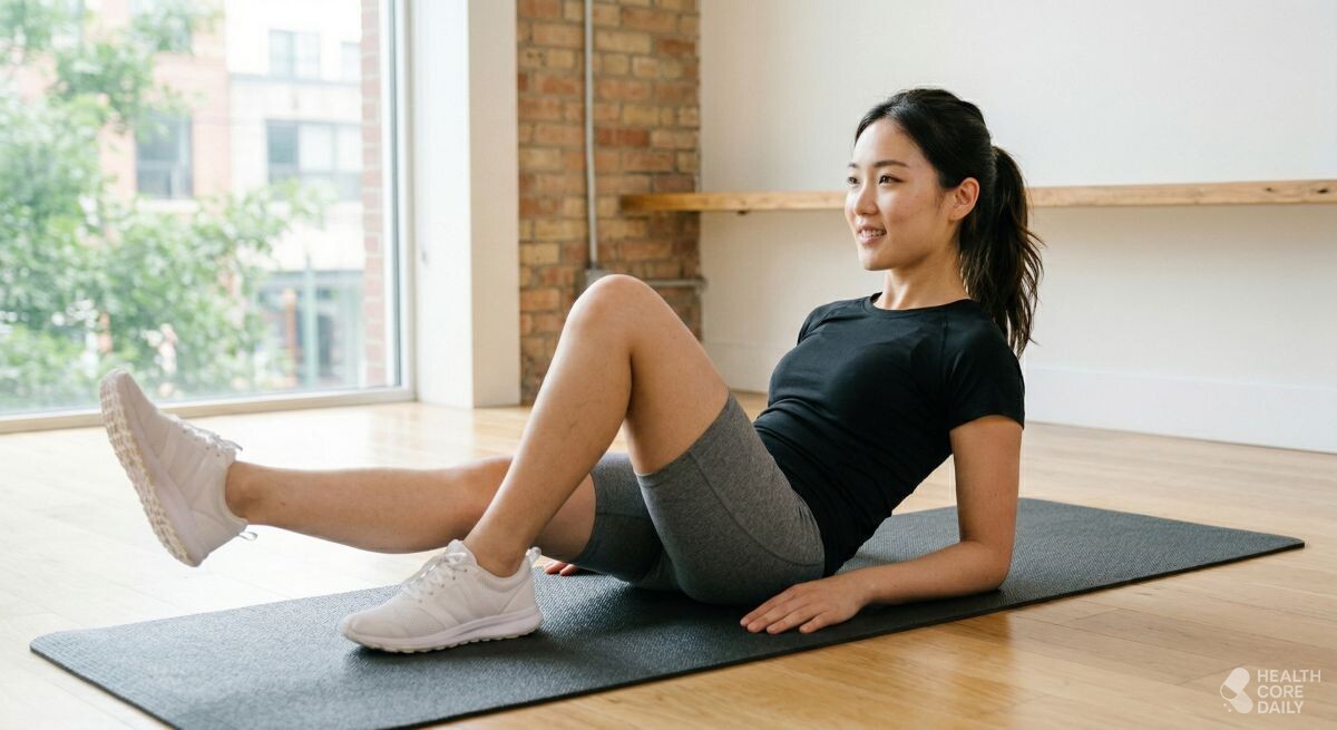 세 번째 동작은 매트에 앉아서 진행하는 무릎 당기기 변형이다. 자리에 엉덩이를 대고 앉은 뒤 상체를 약간 뒤로 기울이고 팔뚝으로 바닥을 지탱한다. 두 다리를 바닥에서 살짝 들어 올려 공중에 띄운 상태가 준비 자세다. 여기서 왼쪽 무릎을 가슴 쪽으로 최대한 끌어당긴다. 다리를 다시 뻗으며 제자리로 보낸 뒤, 바로 오른쪽 무릎을 당기는 과정을 반복한다. 다리가 바닥에 닿지 않도록 주의하며 하복부의 긴장을 계속 유지하는 것이 포인트다. 좌우 다리를 번갈아 움직이는 동안 몸이 심하게 흔들리지 않도록 버티면, 아랫배가 단단해지는 것을 느낄 수 있다.