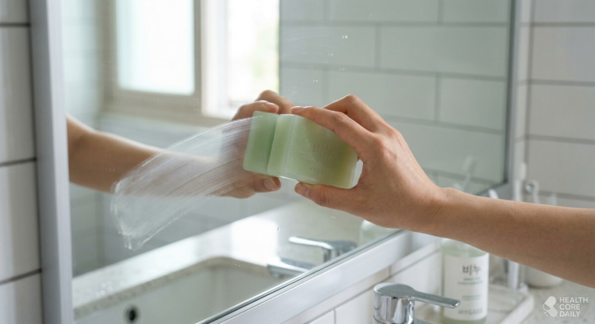 비누를 골고루 바른 뒤에는 부드러운 천으로 비누 자국이 보이지 않을 때까지 가볍게 닦아낸다. 이 과정을 거치면 비누에 포함된 계면활성제가 거울 표면에 얇게 밀착돼 물방울이 맺히는 것을 막아준다. 이는 수증기가 거울에 닿아도 물방울로 뭉치지 않고 흘러내리는 원리를 이용한 것으로, 샤워 후에도 거울이 투명하게 유지되는 효과를 볼 수 있다.