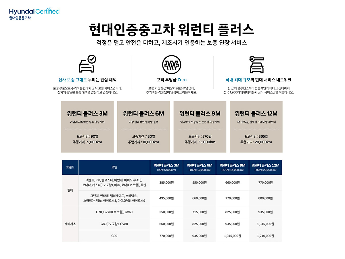 현대자동차가 인증중고차 구매 고객을 위한 추가 보증 상품 ‘현대인증중고차 워런티 플러스’를 출시했다. 해당 상품은 인증중고차 기본 보증 서비스에 추가 보장을 더해 고객이 차량 구매 이후에도 안심하고 운행하도록 돕는다. 현대인증중고차 구매 고객은 차량의 연식이나 주행거리에 관계없이 누구나 이 상품에 가입할 수 있다.