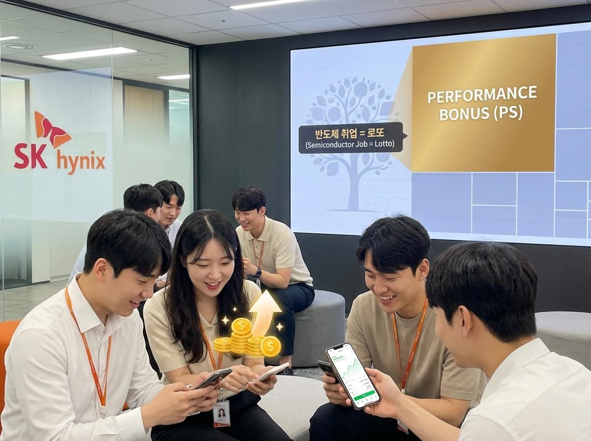 SK하이닉스는 지난해 노사협상을 통해 성과급 상한선을 폐지하고 영업이익의 10%를 초과이익분배금(PS) 재원으로 활용하는 구조를 확정했다. 40조원의 10%면 4조원이다. 이 금액을 임직원 수로 나누는 단순 계산이 취업 커뮤니티와 직장인 익명 앱에서 퍼지면서 "반도체 취업이 로또"라는 인식이 형성됐다.