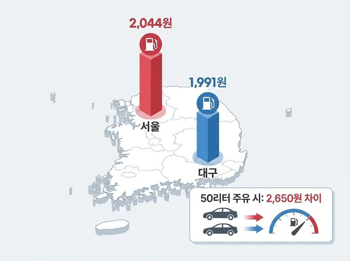 가장 비싼 지역은 서울(2,044원), 가장 저렴한 지역은 대구(1,991원)로 두 지역 간 격차는 리터당 53원에 달했다. 50리터를 가득 채운다고 가정하면 서울과 대구의 주유 비용 차이는 2,650원으로 벌어진다. 단순 계산이지만 월 2~3회 이상 주유하는 운전자라면 거주 지역에 따라 한 달 유류비에서 5,000~8,000원 안팎의 차이가 생길 수 있다.