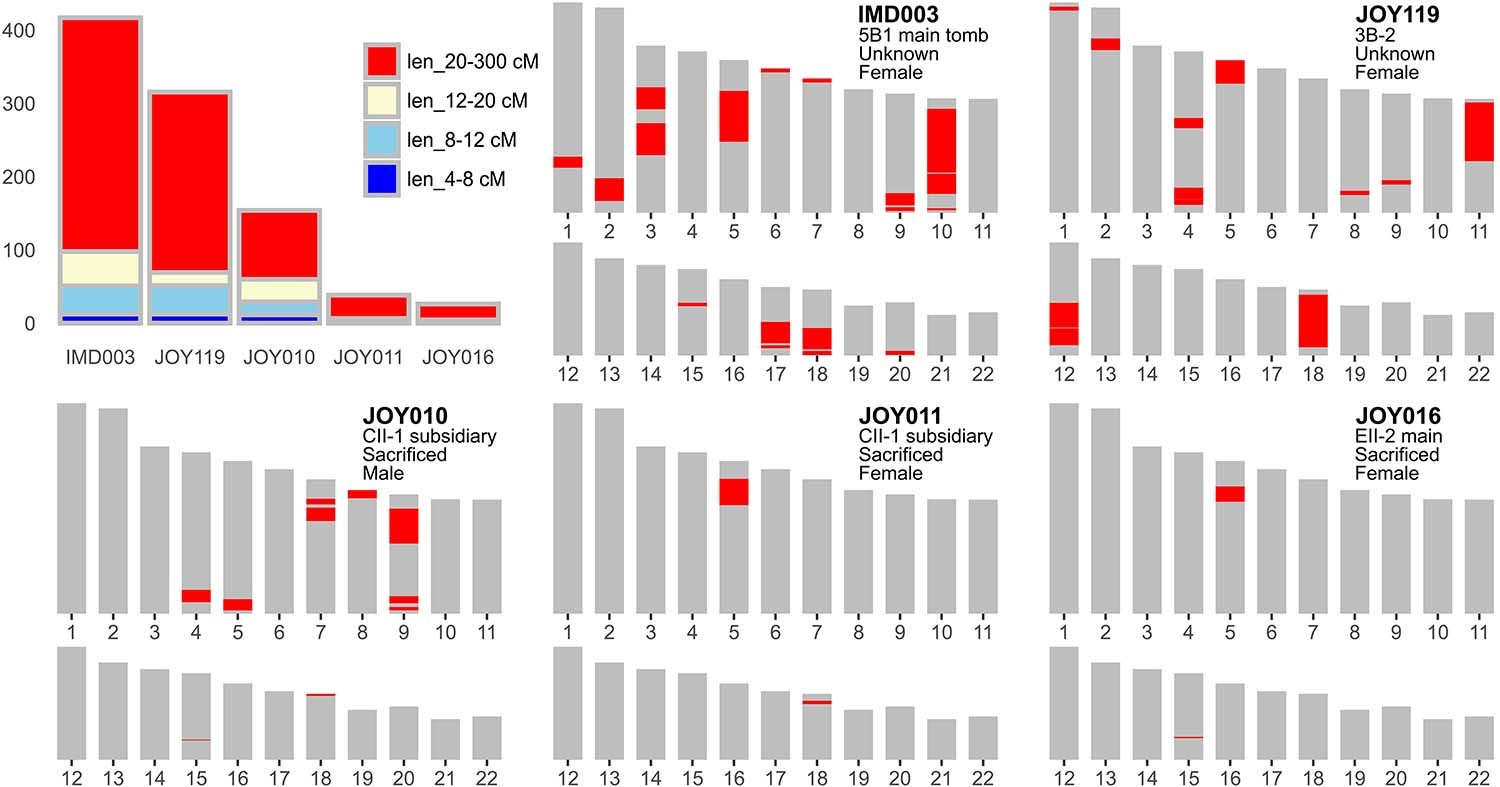 연구진은 78명 가운데 5명에서 20cM(센티모건: 유전적 거리 단위) 이상의 긴 ROH를 발견했다. 특히 한 여성 개인(IMD003)의 경우 ROH가 319cM에 달했는데, 이는 그 여성의 부모가 사촌 이내의 혈연 사이에서 결혼했음을 의미한다. 사촌 간 결혼도 현재 기준으로는 근친혼에 해당하는데, IMD003의 부모는 그보다도 더 가까운 혈연이었을 가능성도 있다. 더 충격적인 사실도 확인됐다. 순장자 가운데 아버지와 딸이 함께 부장실에 매장된 사례가 발견된 것이다. 게다가 이 부녀는 각각 근친혼으로 태어난 개인들로, 근친혼이 2대에 걸쳐 이어진 정황이 포착됐다.