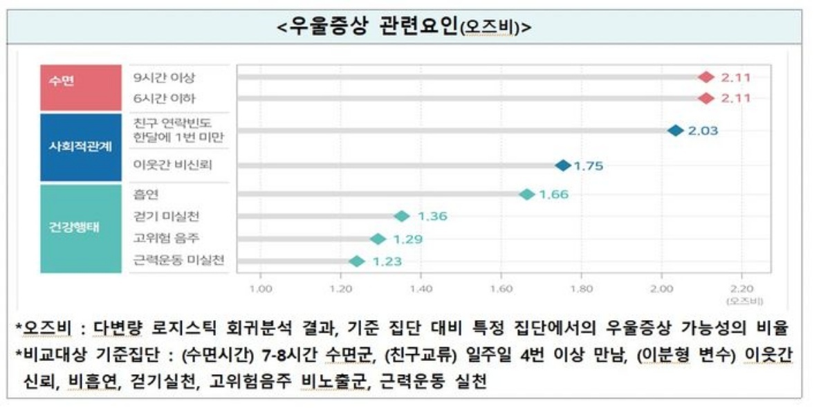 수면의 경우, 하루 7~8시간을 자는 사람과 비교해 6시간 이하 혹은 9시간 이상 자는 이들에게 우울 증상 위험이 2.1배 높았다. 친구와의 교류가 월 1회 미만으로 드문 경우는 2배, 이웃 간 신뢰가 낮은 경우는 1.8배였다.