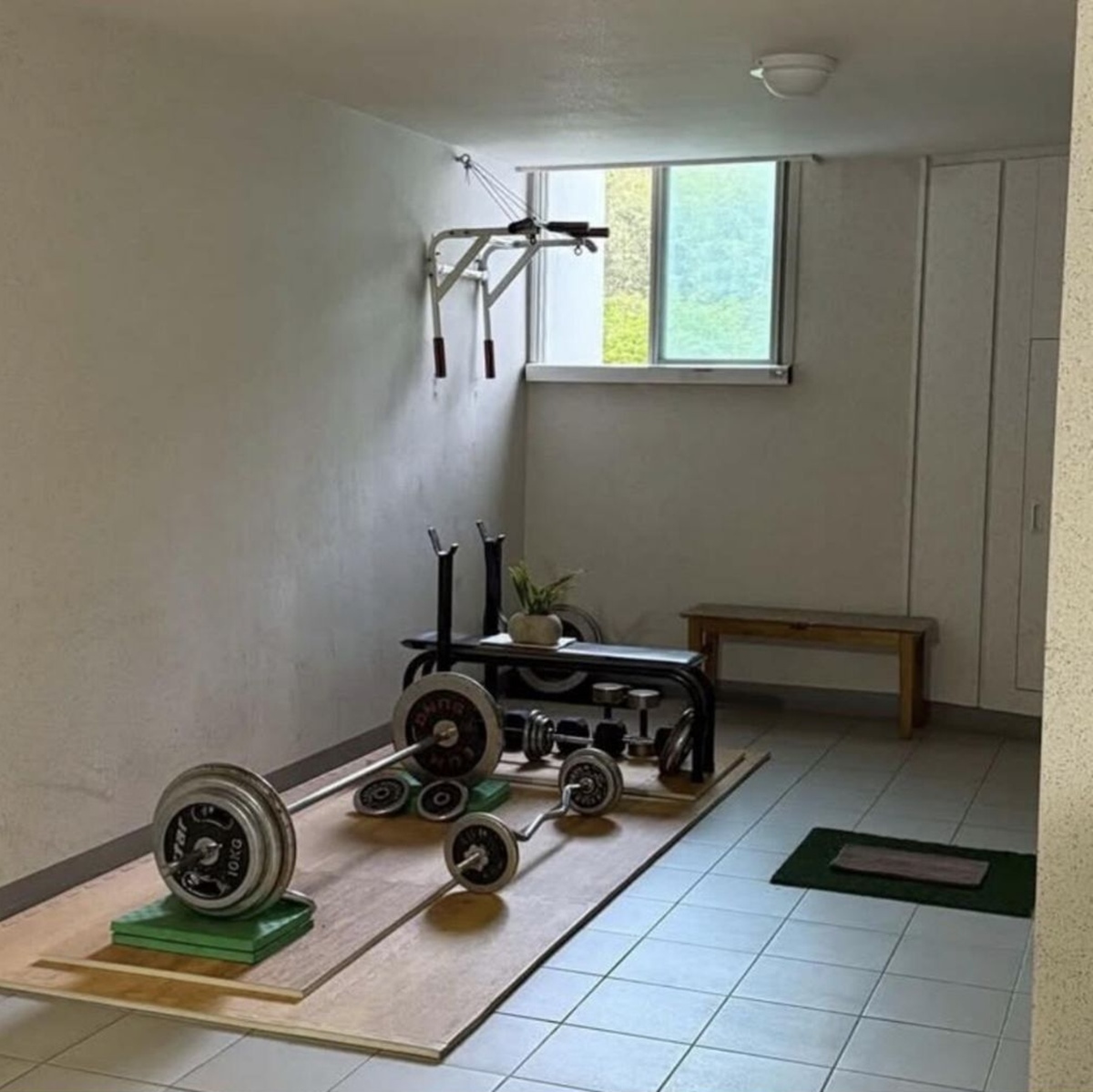 바닥에는 운동 기구 특유의 소음과 충격을 완화하기 위한 고무 매트가 깔려 있어 단순한 임시 방치가 아닌 상시 운동 공간으로 꾸몄음을 짐작게 한다.